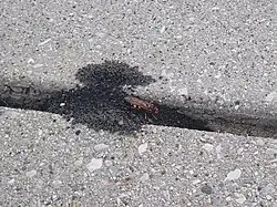 Wasp burrows between the gaps in a concrete driveway.