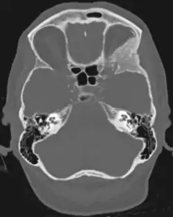 Tumors found in the external third of the sphenoid are of two types: en-plaque and globoid meningiomas. En plaque meningiomas characteristically lead to slowly increasing proptosis with the eye angled downward. Much of this is due to reactive orbital hyperostosis. With invasion of the tumor into the orbit, diplopia is common. Patients with globoid meningiomas often present only with signs of increased intracranial pressure. This leads to various other symptoms including headache and a swollen optic disc. The differential diagnosis for sphenoid wing meningioma includes other types of tumors such as optic nerve sheath meningioma, cranial osteosarcoma, metastases, and also sarcoidosis. Following the physical exam, the diagnosis is confirmed with neuro-imaging. Either a head CT or MRI with contrast such as gadolinium is useful, as meningiomas often show homogenous enhancement. Angiography looking for signs like stretched arteries may be used to supplement evaluation of vascular involvement and to determine whether embolization would be helpful if surgery is being considered.