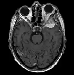 A meningioma is a benign brain tumor. It originates from the arachnoid (not the dura), the tissue covering the brain and spinal cord lying deep to the dura. Meningiomas are much more common in females, and are more common after 50 years of age. Of all cranial meningiomas, about 20% of them are in the sphenoid wing. In some cases, deletions involving chromosome 22 are involved.