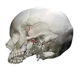 ![]() Inferolateral view of sphenosquamosal suture (red) | |