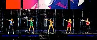 The Spice Girls have performed the song on their four tours, the Spiceworld Tour,[141][142] the Christmas in Spiceworld Tour,[143] the Return of the Spice Girls Tour,[144] and the Spice World – 2019 Tour.[145] For the Spiceworld Tour, during their performance of "Spice Up Your Life", the group dressed in re-imagined outfits of the group's signature look, designed by British stylist Kenny Ho.[146] The performance at the tour's final concert can be found on the video: Spice Girls Live at Wembley Stadium, filmed in London, on 20 September 1998,[147] and released on VHS around two months later.[148] In the Return of the Spice Girls Tour (2007–2008), the group performed "Spice Up Your Life" as the opening song of the show. It started with the screens above the stage displaying an introductory film, which featured five little girls—Spice Girls' look-alikes—opening a magic box, dancing and talking about their wish to be world-famous.[149] Old headlines about them flash up—the last one announcing the end of the group. Then the group appeared standing motionless in five ascending platforms, dressed in tight bronze and copper coloured outfits made by Italian fashion designer Roberto Cavalli.[150][151] During the encore, the group closed the show performing a remix version of the song, each dressed in a glittery outfit of a different colour. At the end, a cannon exploded showering the stage with pieces of paper strips, while flags from different countries flashed across the backdrop screens. As they left the stage, the words "Mission accomplished" appeared on the screens.[151][152] For the Spice World – 2019 Tour, the group performed it as the opening song of the show.[153] Each member dressed in updated versions of their 90s looks, designed by Gabriella Slade,[154] including Brown in a leopard print catsuit, and a floor-length gown adaptation of Halliwell's 1997 Union Jack dress.[155]