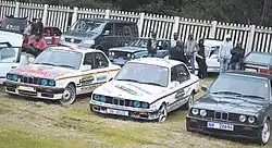 The BMW 325i, known as "gusheshe", is iconic to the sport.[1] In the early days, 5- and 7-series BMWs were favored, before the 3-series became preferred.[5] The BMW 325 has rear-wheel drive[5] and good stability.[6] A BMW 325i can cost R20,000 (about US$1640), and because of the vehicle's image and scarcity, owners often prefer to repair their own vehicles despite the high cost.[5] Other car models used in spinning include Toyota,[6] Chevy, Ford, and Nissan Skyline.[5]