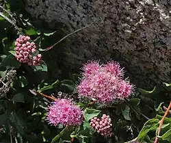 Spiraea splendens is a shrub of the rose family (Rosaceae) native to the western mountains of North America, from California to British Columbia, commonly known as dense-flowered spiraea, rose meadowsweet,[4] rosy spiraea, subalpine spiraea,[4] and mountain spiraea.[5][6] It is commonly found at elevations between 2,000 feet (610 m) and 11,000 feet (3,400 m) on inland mountain ranges.[5] The plant is adapted to cold, moist, rocky slopes, subalpine forests and meadows.[5]