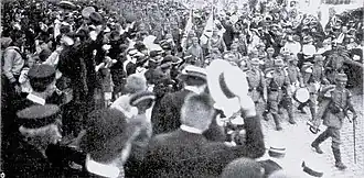 According to police reports on the mood of the population, the war was met with scepticism and anxiety in the working-class districts of the large industrial cities.[28] In a pub in Hamburg, the police heard workingmen ask what the heir to Austria's throne had to do with them and why they should give their lives for him. An SPD official in Bremen said that the mood among the workers there on the first of August was grim: "Mothers, wives and brides bring the young men to the train station and cry. Everyone has the feeling that they are going straight to the slaughterhouse."[7]