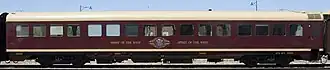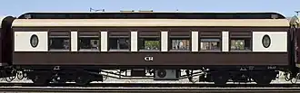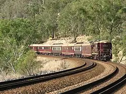 The service commenced with SSRS' K205 hauling a power van and three restored carriages hired from Rail Heritage WA that had been restored for the Centenary of the Federation of Australia.[9][10] A further three carriages were acquired between 2003 and 2005.[11][12] All carriages had been built for the Commonwealth Railways to operate on the Trans-Australian Express. The SSRS owned stock was painted in a maroon and cream livery, the hired Rail Heritage WA stock brown and cream. All were of 1,435 mm (4 ft 8+1⁄2 in) and were stabled at the Midland Railway Workshops.[13]