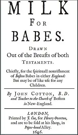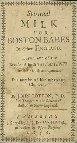 Spiritual Milk for Boston Babes is a children's catechism by the English minister John Cotton.[1] The 1656 catechism is the first known children's book published in the United States.[2][3][4][5][6][7][8][9]