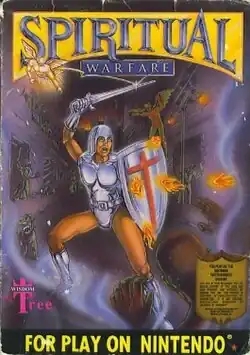 Spiritual Warfare is a 1992 Christian video game developed by Wisdom Tree for the Nintendo Entertainment System, it was later ported to MS-DOS, Game Boy, and Sega Genesis, and re-released as a part of the Spiritual Warfare & Wisdom Tree Collection in 2017 on Steam for Microsoft Windows, Mac OS X, and Linux.[1][2][3][4] The game was not officially licensed by Nintendo for the NES, so it was mostly sold in Christian bookstores instead of traditional video game retailers.[5]
