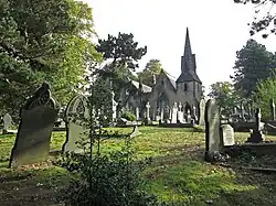 The church and chapel are Grade II listed,[3] but are no longer used for burial services. The chapel has two attractive spires, one in the form of an obelisk and the other a broach spire above the entrance porch. It is in a poor state of repair with deteriorating masonry and water penetration exacerbated by lead theft from the valleys in the roof. Take a stroll around the old graves and read the head stones some of them make fascinating reading, some very sad. Also be very careful, you will find a lot of head stones laid down this is because they have become unstable in the 100 or so years they have been there, also respect the graves, keep pets on a lead whilst in the cemetery, dotted around the cemetery are bins for you to put your pets waste in. At the bottom of the cemetery to the right of the bottom entrance near the Lodge is still an active burial ground for residents who have past.