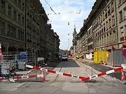 The Spitalgasse is one of the streets in the Old City of Bern, the medieval city center of Bern, Switzerland. It is part of the Äussere Neustadt which was built during the third expansion from 1344 to 1346. The eastern end is at Waisenhausplatz and Bärenplatz while the western end is at Bahnhofplatz near the Church of the Holy Ghost. It is part of the UNESCO Cultural World Heritage Site that encompasses the Old City.