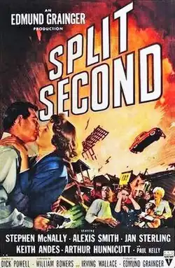 Split Second is a 1953 American film noir thriller directed by Dick Powell about escaped convicts and their hostages holed up in a ghost town, unaware of the grave danger they are in. It features Stephen McNally, Alexis Smith, Jan Sterling, and Keith Andes.[3] It was the only film put into production by the consortium that took over RKO Pictures in late 1952 before previous owner Howard Hughes resumed control of the company.[4]