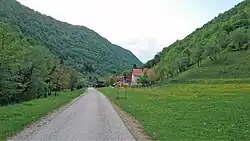 Spodnja Bilpa is a clustered village on a terrace between the Kolpa River and Bilpa Creek (German: Wildbach),[6] which flows to the surface from a cave below a high vertical rock wall.[7] Bilpa Creek is also referred to as Wild Creek (Slovene: Dovji potok) in some sources.[6] During dry periods, the volume of this karst spring greatly decreases, but after rain it gushes out strongly, flowing into the Kolpa.[7] Bilpa Creek was formerly crossed by a wooden bridge, which would be submerged during flooding.[7][8] Pahlin Spring and Jarak Spring lie below the settlement, and Viherle Cave (German: Wicherle)[9] lies above it, to the northwest.[7]