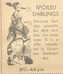 Spoiled Darlings is a 1940 Australian romantic comedy radio play by Edmund Barclay that was broadcast nationally on the ABC.[2]