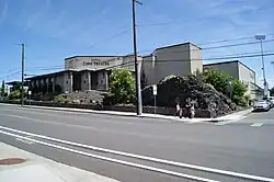 Spokane Civic Theatre is one of few community theatres that owns its own building and land. The building was built in 1967 in the Brutalist style on a $250,000 budget and designed by architect Mortiz Kundig, who referred to the theater job as "a plum of a commission" and the building as "one of my best buildings".[4] The present facility houses two performance spaces: The Margot and Robert Ogden Main Stage Theatre and The Firth J. Chew Studio Theatre. The Main Stage auditorium is a proscenium theatre with a seating capacity of 334, while the Studio theatre is a small, black box theatre seating approximately 85.[5] The seating in the Studio theatre can be moved, which allows specific productions to fill the space in a new way, like the 2011 production of Metamorphoses, which housed a pool. Both stages are wheel-chair accessible, and the Main Stage also provides Sennhiser infra-red assistive listening devices and a Hearing Loop system (installed in 2014) for patrons with hearing disabilities. The backstage area houses a scene shop, sewing room, storage for props, a fully furnished green room, offices and dressing rooms. Children under the age of five, including infants, are not allowed into performances as a courtesy to other patrons.