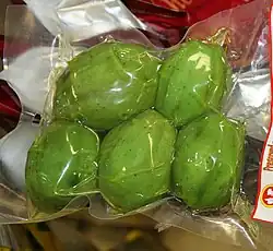 A theory regarding the name of the city of Bangkok, Thailand is that the name is derived from Thai: -มะกอกน้ำ; RTGS: makok nam 'water olive', the Thai name for the fruit of Spondias dulcis.[2] In Cambodia, Spondias pinnata is called /pɷːn siː pʰlaɛ/ (ពោនស៊ីផ្លែ) or /məkaʔ prẹj/ (ម្កាក់ព្រៃ),[3] and Spondias dulcis simply /məkaʔ/ (ម្កាក់). Spondias pinnata is called Pulicha kaai in the Tamil language, which means "sour fruit." It is also called "Amate Kaai" in the Kannada language, Ambade in Tulu and Konkani. In Sri Lanka it is called Amberella. In Bangladesh it is known as Aamra (আমড়া) and when served with seasonings it is a very popular street food.