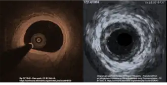 Intracoronary imaging (ICI), consisting of intracoronary optical coherence tomography (OCT) and intravascular ultrasound (IVUS) can help distinguish SCAD from an atherosclerotic lesion when it is difficult to do so with angiography.[19] ICI techniques provide a direct view of the walls of the coronary artery to confirm SCAD, but may actually worsen the dissection as the probes are inserted into the damaged area.[4] ICI confers a 3.4% risk of iatrogenic dissection in people with SCAD compared to 0.2% risk in the general population.[4] Between the two ICI methods, OCT - a newer technique - has superior spatial resolution than IVUS and is the preferred technique if ICI is required,[4] but the need to inject extra contrast with OCT poses risk for worsening the dissection.[14]