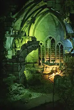 Upon entering the main attraction hall, a number of scary statues and scenes prepared the audience for the main course: a look into the inner court, graveyard, and the ruins of a monastery at night. When the clock struck twelve, a violin (a uv lighted animatronic) started playing Danse Macabre and the witch's curse brought the graveyard to life. Several skeletons and ghosts appeared along with the gardener hanging from a noose and the three judges being reduced to howling undead creatures. One tombstone was labeled in Latin "Puella Innocenta" (innocent girl). The years on her stone (in Roman numerals) revealed that she had been living backwards in time. (However, it is possible that it was merely a mistake of the artist who made the stone.) There was also a tombstone inside the mansion with the name "Den Hegarty", an Irish rock singer who happened to be on the radio when the stone was made. Also, it is said that the main show's appearance was influenced by the 1971 horror film "Tombs of the Blind Dead".
