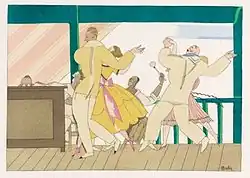 The complex early publication history of Sports et divertissements was elucidated by Ornella Volta in the 1980s.[49] It was apparently ready for the printers when World War I broke out in July 1914. Under ensuing military censorship many French periodicals, including La Gazette du Bon Ton, folded or were suspended.[50] Vogel dissolved his company in 1916 and later sold the materials for Sports to the publisher Maynial. He remained interested in the project, however, and as Maynial made no effort to produce the album Vogel repurchased the rights under his new company Les Editions Lucien Vogel et du Bon Ton in March 1922. Fashions and graphic design had changed dramatically in the intervening years, so Charles Martin was commissioned to replace his original illustrations with a new set of drawings in a Cubist-influenced style; these were rendered into full-color pochoir prints at the studio of Jean Saudé, a leading practitioner of the technique.[51] This edition was announced in January 1923, but the publisher Éditions de La Sirène, which then had Satie under exclusive contract, intervened to assert their rights over the music. The work's release was further delayed as Vogel worked out a settlement with La Sirène.[52]
