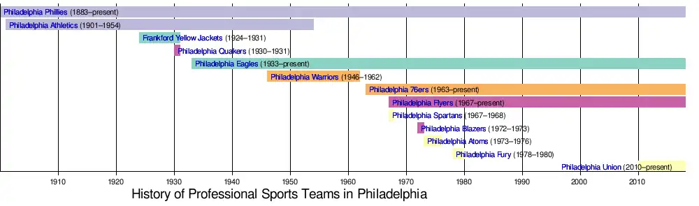 The timeline includes Philadelphia franchises that played in major professional sports leagues after 1900.
