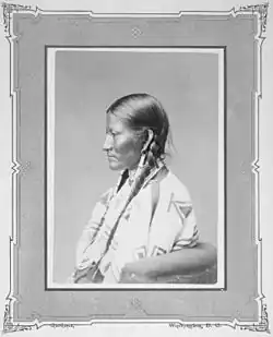 Spotted Tail married and had children. He gained his first wife in 1842, after a deadly fight against chief Mahto Wakuwa ("Running Bear"), and, the killed chief being a famous warrior, young (not even twenty years old) Spotted Tail's reputation probably greatly increased.[12] Eugene Fitch Ware, a Fort Laramie army officer, wrote that Spotted Tail's daughter, Ah-ho-appa (Wheat Flour) named also Hinzinwin (Fallen Leaf) or even Monica, "... was one of those individuals found in all lands, at all places, and among all people; she was misplaced."[13] He suggested that she adopted some European-American practices, and that she was thought to be secretly in love with one of the officers at the fort. When she was dying in 1866, Fallen Leaf made her father promise that she would be buried on a hillside overlooking Fort Laramie. The entire garrison at the post helped Spotted Tail to honor her request by arranging for a ceremonial funeral, including a Christian service and Sioux ceremony. Many years later, Spotted Tail had her remains transported to the Rosebud Indian Agency in South Dakota and re-interred.[14][15]