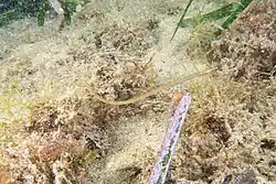 The spotted pipefish, Nerophis maculatus, is a species of Pipefishes, found in the Eastern Atlantic: Portugal and Azores, Mediterranean Sea, especially numerous in its western part and the Adriatic Sea. Ovoviviparous, marine subtropical coastal fish up to 15 centimetres (5.9 in) maximal length. It is inhabits rocky sites of coast, also in aquatic plants and algae, at depth up to 50 metres (160 ft).[2]