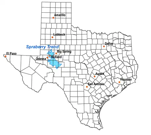 The Spraberry Trend (also known as the Spraberry Field, Spraberry Oil Field, and Spraberry Formation; sometimes erroneously written as Sprayberry) is a large oil field in the Permian Basin of West Texas, covering large parts of six counties, and having a total area of approximately 2,500 square miles (6,500 km2). It is named for Abner Spraberry, the Dawson County farmer who owned the land containing the 1943 discovery well.[1] The Spraberry Trend is itself part of a larger oil-producing region known as the Spraberry-Dean Play, within the Midland Basin. Discovery and development of the field began the postwar economic boom in the nearby city of Midland in the early 1950s. The oil in the Spraberry, however, proved difficult to recover. After about three years of enthusiastic drilling, during which most of the initially promising wells showed precipitous and mysterious production declines, the area was dubbed "the world's largest unrecoverable oil reserve."[2]