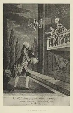 His first appearance on the stage was at the Theatre Royal, Smock Alley, Dublin, on 5 February 1744, and his engagement at once increased its prosperity. His first London appearance was made in 1746 as Othello at the Theatre Royal, Drury Lane. Here his talents were speedily recognized, and in Hamlet and Macbeth he alternated with David Garrick, arousing the latter's jealousy by his success as Romeo. This resulted in his leaving Drury Lane for the Covent Garden Theatre in 1750, accompanied by Mrs Cibber, his Juliet. Both houses now at once put on Romeo and Juliet for a series of rival performances, and Barry's Romeo was preferred by the critics to Garrick's.[1][2]