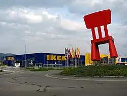 Spreitenbach is a distinguished economic area, because of its protruding position in the west of the Zurich metropolitan area. Over 700 businesses employ about 6900 workers. Of these 1% are in the agricultural sector, 22% in the industrial sector, and 77% in the service sector. The two large shopping centers Shoppi and Tivoli as well as the furniture store IKEA (the first store opened outside of Scandinavia, in 1973), form the backbone of the service economy. Several leading companies operate in Spreitenbach; the most notable are Zweifel Pomy-Chips (potato chips), Bridgestone (car tires), Johnson & Johnson (pharmacy/cosmetics), Nestlé (foodstuffs), Miele (household goods), and Globus (retail trade).