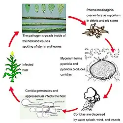Phoma medicaginis overwinters as mycelium in old stems and fallen leaves, where small pimple-like structures form, called pycnidia, the asexual fruiting body. In spring, many pycnidiospores are released and dispersed by the presence of free water.[1] The small distance dispersal occurs by water splash and dew, while it is spread further distances by wind, insects, infected seed from the host, and human activities.[4] Spores germinate about 24 hours after their deposition on susceptible alfalfa leaves if the proper environmental cues are present, a cool, wet environment. Germ tubes grow towards the surface of epidermal cells and penetrate through the use of an appresorium. Infection of new shoots occurs as they grow through the residue or stubble of previous alfalfa crops as well.[5] The fungus invades inter- and intracellular spaces, and chlorosis of the epidermal cells is seen in as little as 3 days after inoculation. Pycnidia with pycnidiospores are produced after 6 to 8 days, and may erupt through the epidermis of the plant.