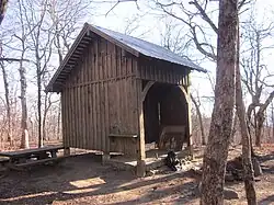 The nearest shelter from the summit is the Springer Mountain Shelter, located about 0.2 miles (0.32 km) north of the summit. A water spring is located near this shelter.[15][16] The shelter was built in 1993 and is maintained by the Georgia Appalachian Trail Club.[17] Another nearby shelter is the Black Gap Shelter, located about 1.5 miles (2.4 km) south of the summit on the Appalachian Approach Trail.[10]