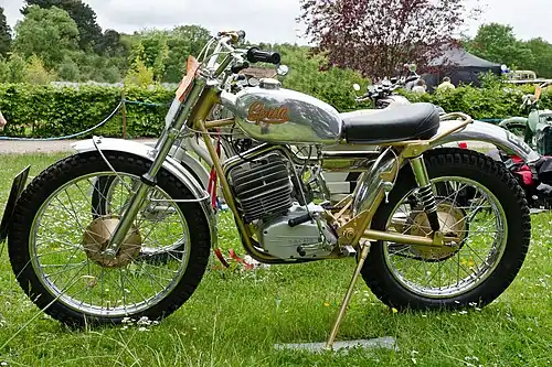 Sprite manufactured trials and scrambles frames which were usually available as a kit-form motorcycle to avoid UK Purchase Tax.[2][4] The first machine was developed as a scrambler with Alpha 246 cc two-stroke engine and a modified Cotton frame, followed by their own Sprite-framed version and a slightly larger frame-only (without engine) option to use a 490 cc Triumph unit construction engine/gearbox for the larger class of scrambling. The trials machine was developed for production in late 1964 using a Villiers 36A/37A 246 cc engine with iron barrel or at a higher cost, a Greeves light-alloy cylinder, and a Miller magneto.[1][2]