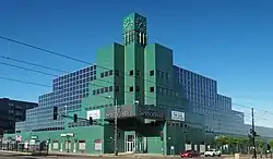 Reception of the architectural design of the building has been mixed with the unique look and design often highlighted. The building has been described as having "grotesque green architecture"[27] and Reuters described the building as the 4th ugliest in the world in 2011.[28] A Chicago Tribune columnist described it as a 1980s version of the Emerald City that "almost forces residents to look at it".[7] Star Tribune readers identified it as the 7th ugliest building in the Twin Cities in 2000. One reader commented that it "personified bad taste" and looked "like a tawdry example of what a bus station's tiled restroom would look like."[11] Others have described it as "spectacularly, ambitiously ugly". Architectural critic Larry Millett described mixed feelings about the design but suggested the building deserved respect for making a statement and having the most architectural presence of buildings at the Snelling and University Avenue intersections.[24]
