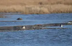 ![]() A Hudsonian godwit (left) and a greater yellowlegs located north of the river. | |