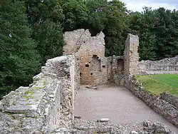 The first castle was a wooden structure built in the late 12th century and was revealed in excavations carried out between 1986 and 1994.[7] The excavated evidence suggests that the buildings were surrounded by a rectangular ring work and ditch which seem to have enclosed an area of roughly the same as the 14th-century curtain wall, i.e., an enclosure of 45 – 65 m and is large even by medieval ring works found elsewhere in Britain. The buildings would likely have consisted of the bishop's house with a hall, a bed chamber and a chapel and also holding a brewhouse and a bakehouse.[6]