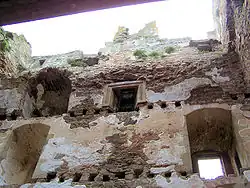 The most significant buildings were established in the later 15th century through into the 16th century when David's Tower (also known as Davey's Tower) was built along with other substantial accommodation areas. The tower is the largest by volume of all medieval Scottish towers measuring 19 m by 13.5 m and 22 m in height and was started by Bishop David Stewart (1462–76) and completed by Bishop William Tulloch (1477–82).[16] It has 6 storeys above ground and had a garret on the top. Below ground is a vaulted basement which is approximately 1.5 m below the level of the courtyard; it contains a circular dungeon, 5.3 m in diameter, lit only by a narrow loop looking to the west and has a slightly domed vaulted roof.[17] The ground floor contained the hall which is 12.8 m by 6.7 m and lit by large windows with built-in stone seats.[17] At the NE corner was a spiral staircase which led to the upper floors. Each of these floors was similar in design with a single large room and smaller chambers leading off it. The tower is plain and practically lacking in architectural features; the external walls were originally rendered while the internal walls were plastered.[18]