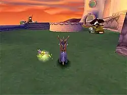 Spyro has two main offensive moves, which are used to attack enemies as well as destroy certain objects: charging, in which Spyro sprints forward and rams into things with his head, and breathing fire. These attacks must be used appropriately for certain enemies and situations; for instance, some enemies carry fireproof metal armor, meaning that they can only be defeated by charging, while larger enemies can only be hit using fire breath, as they will immediately crush Spyro otherwise.[2] Spyro can also use his wings to glide in midair, letting him travel further distances in the air and access areas otherwise unreachable via a regular jump.[5][6] Throughout the game, Spyro is accompanied by Sparx, a yellow dragonfly who protects Spyro from taking damage and serves as the player's system of health. Sparx's current health is represented by the color of his body; if Spyro is hurt by an obstacle, such as an enemy or by touching water, Sparx changes colors, with yellow, blue and green representing different subsequent amounts of withheld damage. If the player is damaged too many times, Sparx disappears, leaving Spyro vulnerable to losing a life if he is hurt again. Sparx can be rejuvenated by consuming butterflies, which are found by killing passive creatures such as sheep that roam throughout most levels.[7] Sparx also helps Spyro collect items by retrieving any gems that Spyro passes by.[2]
