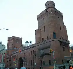 The 94th Street Armory came down in 1965, but its façade, with the Squadron motto BOUTEZ EN AVANT (Charge!) plaque is still intact, and the Hunter College High School building now occupying the rest of the block takes its architectural cues from the original Armory design.