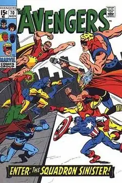 ![]() The Squadron Sinister (left) battle the Avengers on the cover to The Avengers #70 (Nov. 1969). Art by Sal Buscema. | |