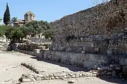 The north wall was one of the best-preserved sections, since it acts as a retaining wall and was thus incorporated into the stoa of Attalos and the Post-Herulian Wall.[8] It survives to a height of nine courses.[8] The lower courses were set in the bedrock and made of soft, creamy poros which was meant to be covered over by soil so that it was not visible.[8] The upper section has made from hard grey poros. Remnants of the mudbrick wall of the superstructure were found, fallen to the south.[9] Much of the wall was relocated to form the back wall of South Stoa II, where it is most easily visible.[9]