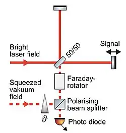 Squeezed light is used to reduce the photon counting noise (shot noise) in optical high-precision measurements, most notably in laser interferometers. There are a large number of proof-of-principle experiments.[23][24] Laser interferometers split a laser beam in two paths and overlap them again afterwards. If the relative optical path length changes, the interference changes, and the light power in the interferometer's output port as well. This light power is detected with a photo diode providing a continuous voltage signal. If for instance the position of one interferometer mirror vibrates and thereby causes an oscillating path length difference, the output light has an amplitude modulation of the same frequency. Independent of the existence of such a (classical) signal, a beam of light always carries at least the vacuum state uncertainty (see above). The (modulation) signal with respect to this uncertainty can be improved by using a higher light power inside the interferometer arms, since the signal increases with the light power. This is the reason (in fact the only one) why Michelson interferometers for the detection of gravitational waves use very high optical power. High light power, however, produces technical problems. Mirror surfaces absorb parts of the light, become warmer, get thermally deformed and reduce the interferometer's interference contrast. Furthermore, an excessive light power can excite unstable mechanical vibrations of the mirrors. These consequences are mitigated if squeezed states of light are used for improving the signal-to-noise-ratio. Squeezed states of light do not increase the light's power. They also do not increase the signal, but instead reduce the noise.[8]