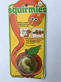 Squirmles (also known as Snoots, Magic Twisty Worms, Wiggle Worms, or Worm on a String) are small, worm-like toys with eyes, a furry body, and a hidden string used to imitate a live worm, sometimes used as a magic trick. A popular toy released in the mid-1970s by the Illfelder Importing Company,[1] Squirmles come in a variety of colors and are measured at 8.5 by 0.5 in (21.6 by 1.3 cm). They are typically found in discount stores in the United States.