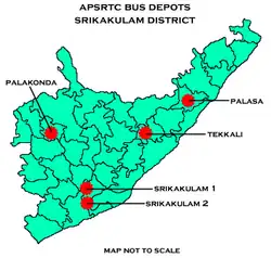 The total road length of state highways in the district is 959 km (596 mi).[26] Andhra Pradesh State Road Transport Corporation runs bus services to all the major cities and towns of the state from the district. Major railway stations in the district include Amudalavalasa, Srikakulam Road railway station, Palasa railway station ( major station) Naupada, Ichchapuram and Sompeta etc.