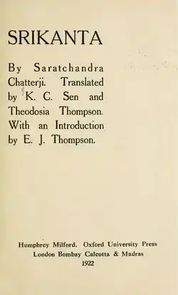 Srikanta was translated into English by Sachchidananda Vatsyayan 'Agyeya' in 1944.[9][10] It was translated into French by J G Delamain (1930), and into Italian by Ferdinando Belloni-Filippi (1925).[11] In 2006, it was translated into Spanish by Gloria Khisha.[12]