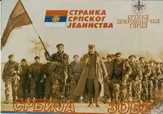 Thorough commonly described as a Serbian ultra-nationalist group, the SDG seemed to have been more interested in plundering, rape, and murder with nationalism serving as a convenient justification for their crimes.[12] In this, the SDG differed significantly from the Chetniks associated with Vojislav Šešelj and the Serbian Guard led by Vuk Drašković, both of which seemed to be more sincere in their nationalism.[11] The gangster Ražnatović had functioned since the 1970s as a sort of state-sanctioned criminal whose criminal activities were tolerated by the Yugoslav state in exchange for him performing services as assassinations that the Yugoslav state did not wish to be seen doing itself.[13] The SDG was the best equipped of the various para-military militias founded in the early 1990s, being supplied by the Yugoslav People's Army with guns, ammunition, lorries, light artillery, and shells.[6] The German political scientist Klaus Schlichte wrote that Ražnatović in founding and leading the SDG was almost certainly continuing his traditional role as a state-sanctioned criminal who was performing tasks on behalf of the state that the state did not wish to be seen doing itself.[6] Ražnatović openly recruited for his militia with no interference from the authorities and obtained weapons from the Yugoslav Army, which suggested that his activities were sanctioned at the highest level in Belgrade.[14] A former secretary for Ražnatović known only as B129 due to a court order testified at the International Criminal Tribunal for the former Yugoslavia in 2003 that the SDG was under the operational order of the state security officials and that Ražnatović was in no way independent.[14]