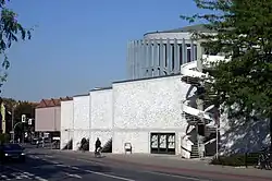 The Stadttheater building was one of the first new theatre buildings in Germany after World War II. It was built between 1952 and 1956 by a team of young architects,[1] when Hermann Wedekind was the intendant. The architects designed a paraboloid stage tower and a rising hall with three tiers. Elements such as spiral stairs and thin supports were supposed to add to a sensitive elegance, in opposition to traditional theatre building.[1] When it opened on 4 February 1956 it was regarded as the first new theatre building in the Bundesrepublik and received international attention.[2] It was a landmark for culture and architecture for the town and the region.[2] On the site, the war had left only remnants of former buildings: a municipal hall, music school and a theatre. Some ruins of the Romberger Hof, the former music school, were integrated in the new structure, also two sycamore trees that had survived were made part of the new courtyard.[2] In September 2012, the theatre's name was changed to Theater Münster.[3]