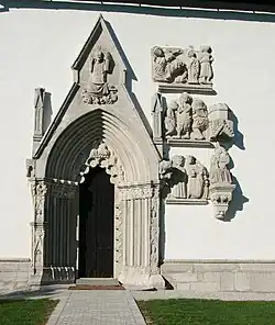 The main pointed-arch portal of the church is made of grey limestone. The capitals of the pillars, the outermost posts of the portal, the tympanum and the wimperg are all decorated with sculptures. The tympanum contains a depiction of the Coronation of the Virgin, accompanied by the apostles John, Peter and Paul as well as John the Baptist. The eastern band of capitals, partially damaged, depicts scenes from the life of Mary while the western depict scenes from the childhood of Christ.[20] The rectangular sides of the outer posts of the portal, facing south, are decorated with sculptures of four standing figures, probably saints. They are framed by aediculae. The wimperg, flanked by two pinnacles, contains a sculpture of the Resurrection of Jesus.[21]