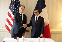 On 11 January 2024, Séjourné was appointed minister of Europe and foreign affairs in Gabriel Attal's government.[13] His first official trip abroad was to Germany for a meeting with his counterpart Annalena Baerbock.[14] Séjourné criticized South Africa's ICJ genocide case against Israel, saying "To accuse the Jewish state of genocide is to cross a moral threshold."[15]