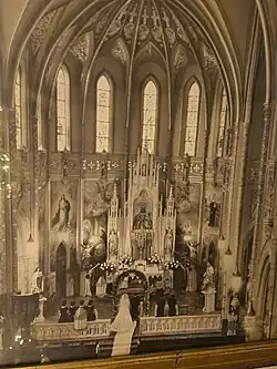 The next Pastor was Rev. John W Osadnik led the parish beginning on February 7, 1920. His forte was being responsible for so many souls and he concerned himself at all times with making them conscious of daily progress in Christian virtue. Bernice Klug became the first parish organist in 1920. Rev Osadnik decided soon after he became pastor that the Church School building was inadequate as a church and school. Therefore, a parish meeting was held in 1923 to discuss the renovation of the original building for a school and the erection of a new church. The official laying and dedication of the cornerstone for the new church took place on July 29, 1923. Due to lack of funds, the work began but proceeded slowly. This was but another example of the continued struggle of the parishioners spurred on by a fervent pastor. The new church, considered the largest and most beautiful in the Diocese was completed in spring of 1926 at a cost of $23,000 and was blessed by Bishop John F. Noll. It originally was built to be the diocese's cathedral, but a new building was then designated, in what was considered a slight to the polish community.[1] Rev. Aloysius Jarka and Rev. John Biernacki served as assistants at that time. In May 1931, a temporary parish hall was erected because the depression caused deep financial stress. The Parish celebrated its Silver Jubilee on Sunday, October 20, 1935. Now a Monsignor, Rev. Osadnik retired on January 23, 1940. He was followed by Rev. Aloysius Jarka appointed by Bishop Noll. Due to illness Rev. Jarka's pastorship was short and he passed on September 20, 1943. Another memorable event took place during this era as Rev. Louis Ratajczak became the first parishioner to be ordained on May 26, 1923, by Bishop Aldering. Other assistants serving the growing congregation included Rev. Anthony Nadolny, Rev. Michael A. Petzold, Rev. Augustine S. Kondziela, Rev. Wenceslaus A. Karp, Rev. Michael Urbanski, Rev. Leon Pisula, Rev. John Moskal and Rev. Joseph Zielinski. New ordinations of parishioners continued in 1931 with Rev. Clement Ewald, Rev. Casimir Moskwinski and Rev. Louis Jeziorski being ordained priests.