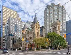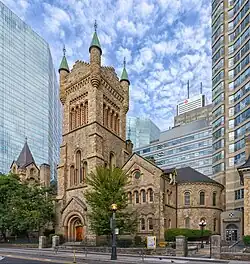 St. Andrew's Church is a historic Presbyterian church located at the corner of King Street West and Simcoe Street in the city's downtown core of Toronto, Ontario, Canada. It was designed by William George Storm in the Romanesque Revival style and completed in 1876.