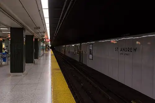 St. Andrew is a subway station on Line 1 Yonge–University in Toronto, Ontario, Canada. It is located under University Avenue where it is intersected by King Street West. The station, which opened in 1963, is named for the nearby St. Andrew's Presbyterian Church.