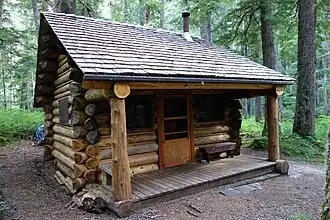 The St. Andrews Patrol Cabin was built by the National Park Service in 1922 as part of a network of stations near the boundaries of Mount Rainier National Park for rangers on patrol. The one-room log structure stands along St. Andrews Creek and St. Andrews Creek Trail near the Westside Road and the western boundary of the national park. The exterior of the cabin features a porch to the front. The interior is finished with varnished logs and tongue and groove flooring.[2] The cabin was placed on the National Register of Historic Places on March 13, 1991. It is part of the Mount Rainier National Historic Landmark District, which encompasses the entire park and which recognizes the park's inventory of Park Service-designed rustic architecture.[1]